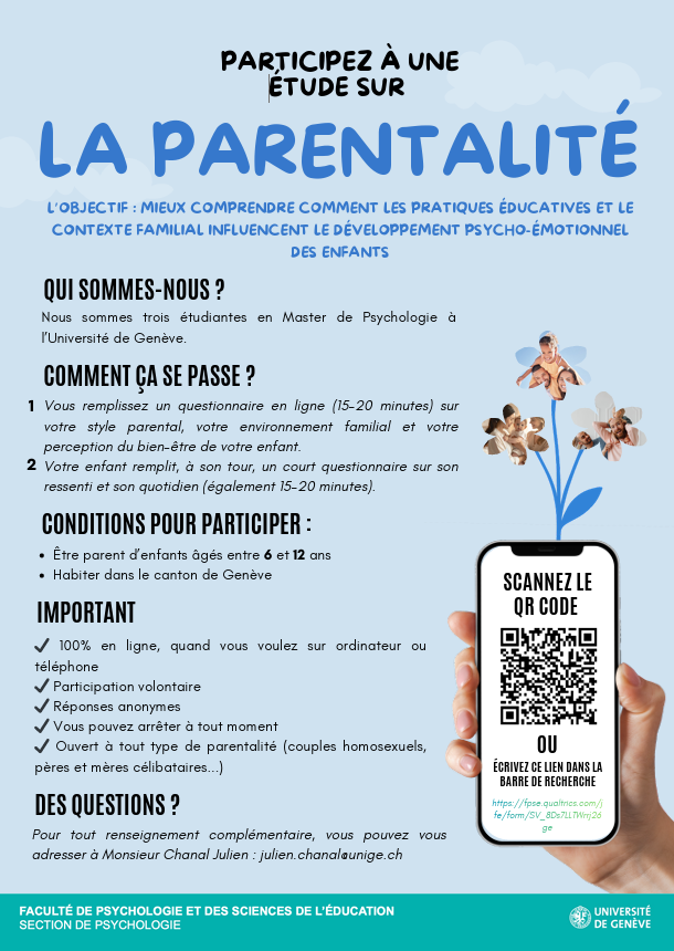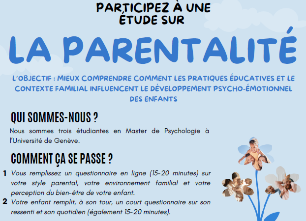 Participez à une étude de mémoire portant sur la parentalité et le développement socio-affectif des enfants, menée à l’Université de Genève.
